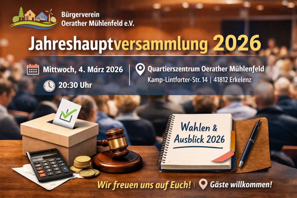 Liebe Vereinsmitglieder und Anwohner,im Namen des Bürgervereins Oerather Mühlenfeld e.V. laden wir Euch herzlich zur diesjährigen Jahreshauptversammlung am Mittwoch, den 4. März 2026, um 20:30 Uhr im Quartierszentrum Oerather Mühlenfeld ein. Neben einem Rückblick auf das Jahr 2025 möchten wir mit Euch über die Gestaltung und Nutzung der Vereinsräume sowie unsere Pläne für 2026 sprechen. […]